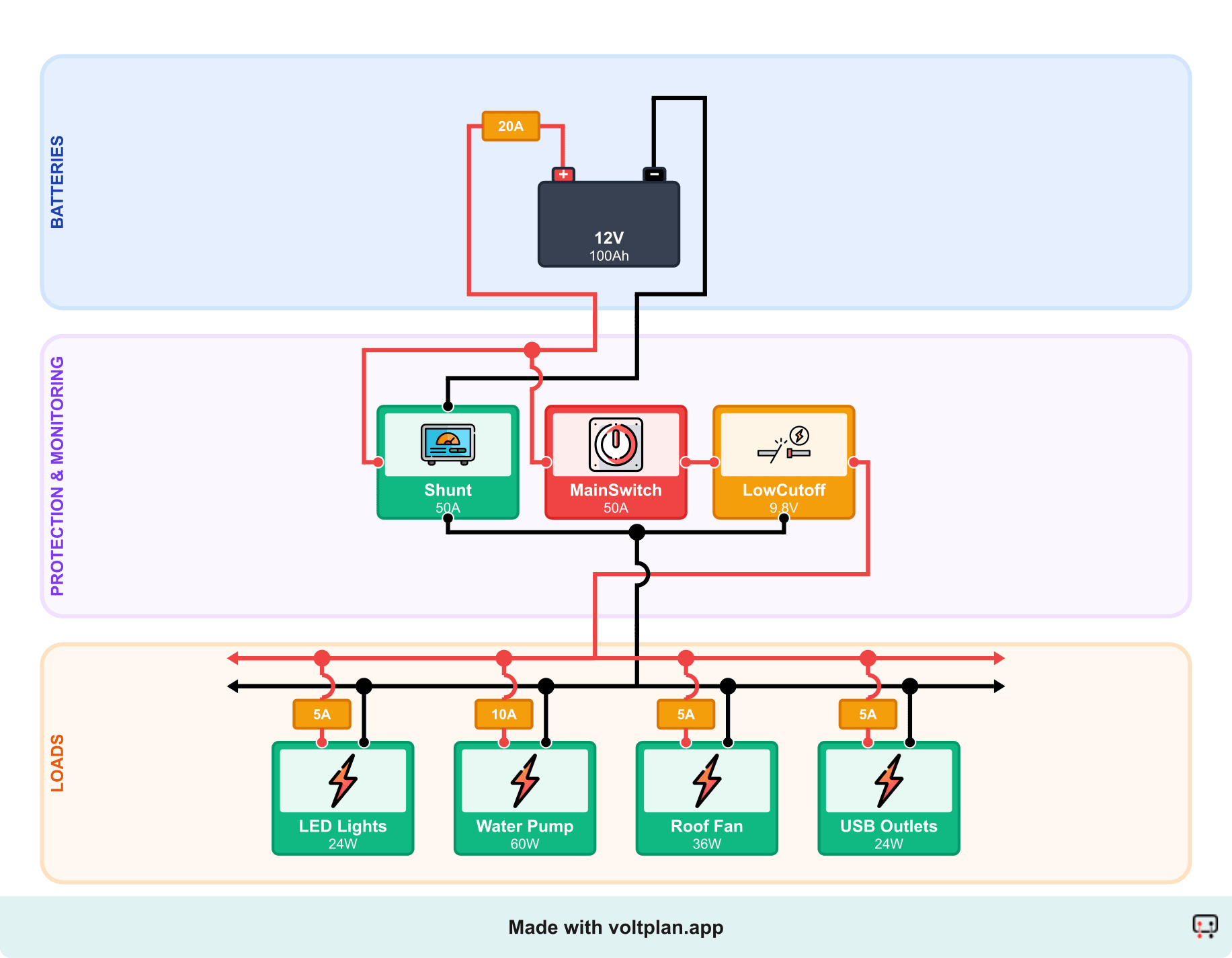 VoltPlan es un planificador online gratuito de esquemas eléctricos para campers y furgonetas. Elige los componentes, colócalos arrastrando y obtén automáticamente secciones de cable, protecciones y un esquema imprimible, sin necesidad de registro para empezar.